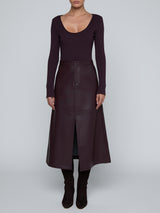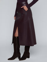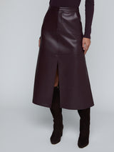 The Robyn A-line midi skirt is crafted from vegan lather in a rich dark malbec hue. Its high-waisted silhouette is cleanly tailored with panel seaming, a front slit for ease of movement, and a flattering flared shape that falls just below the knee. Sleek yet versatile, it’s a chic staple that pairs well with just about everything.
