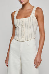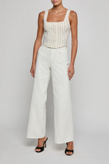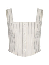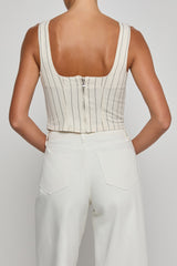 Our bestselling Saga top is here for the first time in a cotton twill. Nautical stripes bring a fresh update to this flattering, corset-inspired essential. A must for your vacation packing list and everyday rotation.