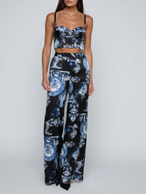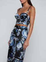 The Sonya is a silk bustier top, now back in a whimsical porcelain print. Wear it with the coordinating pieces for a modern approach to suiting, or pair it with your favorite jeans for a night out.