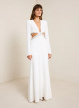 The Trina Dress is impeccably cut from winter white fabric enhanced with shimmering rhinestones. This maxi silhouette features long sleeves, a plunging neckline, and waist cutouts that wrap around into an open back.