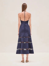 The Janessa Dress is a cotton halter midi design featuring cut-out ladder detailing.