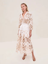 The Portello Dress is a cotton midi design featuring intricate eyelet detailing and a drawstring waist.