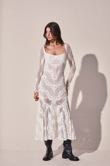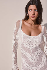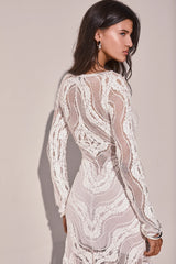 Exude elegance in the MARINA dress—a silhouette that hugs the body and flows into a subtly flared skirt, sculpting a graceful and refined figure. Crafted in wavy-textured mesh, its design naturally molds to the torso, flattering the shape. A rounded neckline and sheer long sleeves bring harmony to the look, while the skirt opens gently from the hips, adding movement and fluidity. A refined, versatile piece perfect for special occasions or unforgettable celebrations.