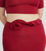 The Cowan set features a fitted, short-sleeve top with a boat neckline, paired with a column-style skirt that is adorned with an asymmetric ruffle at the waist that cascades into a delicate 3D floral detail on the side.