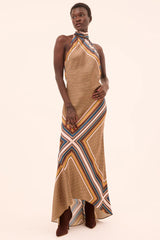 Minerva is a head-turning maxi silhouette cut from chic Autumn Scarf printed satin. A high halter tie neckline flows into a dramatic open back with a hidden zip closure, while the beautifully draped skirt falls to an asymmetrical high-low hem. The perfect transitional piece for all your special events.