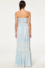 The Sanya dress is a lightweight, strapless maxi cut from stretch cotton in a soft pale blue and cream Linear Geo print. Designed for summer ease, it features a fully smocked bodice with delicate ruffle trim at the bust and waist. The pull-on silhouette flows into a full skirt with a wide ruffle hem and side slit pockets. Effortlessly chic for daytime outings, weekends, or warm-weather getaways.