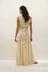 A unique maxi dress, designed from a signature 100% European Flax® linen in a warm neutral. Featuring a sleeveless, asymmetric neckline, the bodice is softly fitted with subtle gathering through the sides for a more flattering fit. The silhouette also offers an asymmetric drop waist with a contrasting responsible rayon skirt. Gathered for a feminine touch, style with a simple sandal for summer occasionwear.