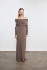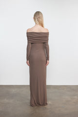 A fluid off-shoulder maxi dress with a gathered neckline, made from our signature silk-blend rib and designed with a relaxed fit throughout the body.