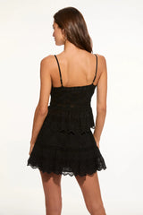 Cute and chic in the Rowina Top. This easy piece debuts with a stretchy, ultra-light cotton voile fabric with zig zag wide vintage-inspired laces and delicate threaded ribbon trims. The peplum cami top is fitted at the waist, has smocking at the back, and is finished with flirty flounce hem.