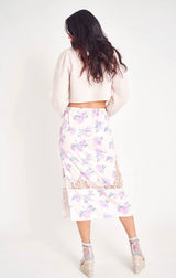 Springtime’s in bloom with our Fayette Skirt. This easy slip skirt features a charming floral on a soft poly charmeuse fabric. The midi begins with an elastic waistband and descends to a flowing skirt with custom lace insets.