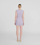 The Entredos mini dress, crafted from our semi transparent lycra, features a high round neckline and a cinched, ruched silhouette at both front and back, finished with an adjustable side-knotted sash at the front.