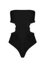 Halter neckline one-piece, featuring a draped double layer at the front, that highlights a 3D handmade flower in center front. The deep open back with ruched detail and a thin strap that ties at the neck completes this striking design—a seamless blend of iconic elements that embody the essence of our brand.