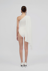 Experience effortless elegance with the Maygel Coronel Vionnet Asymmetric Bodysuit. This slim fit sleeveless bodysuit features an asymmetric neck and a draped cape, perfect for making a statement. Made in Colombia from high-quality materials, it is unlined and easy to pull on. Hand wash for long-lasting luxury.