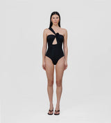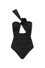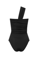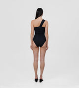 The Rodríguez one-piece features a one-shoulder design with a ruched diagonal strap that contours a subtle heart-shape neckline and frames a central cut-out, finished with a 3D floral detail. The front reveals a softly gathered bodice, while the back is fully ruched, blending structure and sensuality.