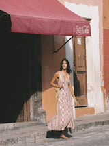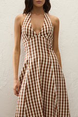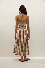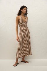 A 1960s-inspired midi dress, designed from a signature 100% European Flax® linen in a nostalgic gingham print. Fitted through the bodice with a V-neckline and halter neck ties, it is shirred through the back waist before falling into a soft A-line skirt that crops below the knees. Style with a simple heel for effortless day to night dressing.