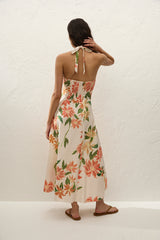- LINEN FABRIC - MIDI DRESS - HALTER NECK - SHIRRED BACK PANEL FLARED SKIRT - ZIP OPENING -PARTIALLY LINED
