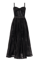 Sleek and striking, this midi dress is cut from sheer black tulle with shimmering lurex pinstripes throughout. The corset-style bodice features a sculpted bust and delicate straps, while the belted waist defines the silhouette before falling into a softly pleated A-line skirt. Finished with a concealed back zipper closure, it balances structure and fluidity with modern elegance.