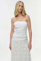 The Annalise Cotton Lace Midi Dress in Ivory. Crafted from a mix of pointelle knit and cotton poplin, this midi dress features a strapless bustier, sculpted bodice and flowing pleated lace skirt.