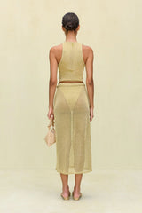 A sheer low rise midi skirt crafted in a shimmering gold knit yarn that has a removable slip.