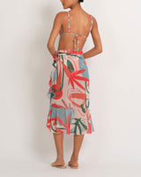 Easy-to-wear midi wrap skirt in our original Rio print on lightweight chiffon fabric. High waist fit with tie wrap closure. Cascading side ruffle detail. Fully lined. Runs true to size.