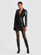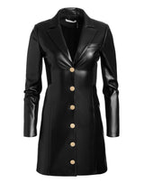 Sharp and sleek with unexpected details, our Michelle is the blazer dress you’ll reach for all fall long. Cut from a glossy vegan leather, it’s designed with strong shoulders, gold front buttons, and buttoned cuffs. Knit panels at the sides add stretch and comfort, sculpting your shape perfectly. Equal parts tough and tailored, it’s your go-to for post-work happy hour.