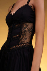 The flattering skater silhouette is reinvented with our Terely mini dress. Delicate lace sides create a rich texture along with the voile and guipure that combine throughout the length of the piece. Its button placket joins a feminine bust with a pretty mini skirt.