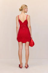 An artful knit mini dress featuring petal-like cutout designs, a layered bodice and a scalloped hem.