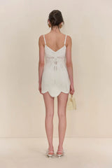 An artful knit mini dress featuring petal-like cutout designs, a layered bodice and a scalloped hem.