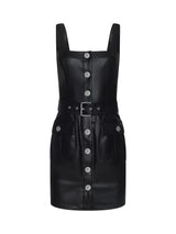The structured fit of our bestselling Midy mini dress shapes and sculpts the figure while an adjustable belt cinches the waist. Now in black vegan leather.