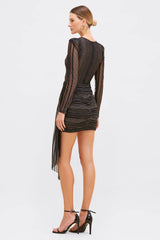 This striking mini dress pairs high-shine glamour with a daring silhouette. Made from sheer lurex fabric with shimmering metallic stripes, it features a plunging neckline and bold shoulder detailing for a structured look. The draped waistline flatters the figure, while the asymmetric sash adds movement and flair. Closes with a concealed back zipper for a flawless finish.