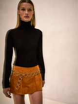 The Nita Skirt is a suede mini skirt featuring a gold ring belt detail and front patch pockets.