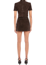 Mid-rise suede mini skirt with pockets. Pair with the Tessi Suede Top. Shown here in Tobacco.