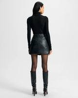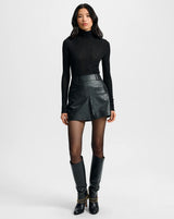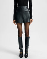 Sleek, versatile, and endlessly wearable. Crafted from supple black vegan leather, the Pavaline mini skirt features a classic A-line silhouette with a subtle front slit for ease. Front welt pockets and belt loops finish the look. Pair with a cashmere sweater for a polished look, or a simple tee for effortless ease.