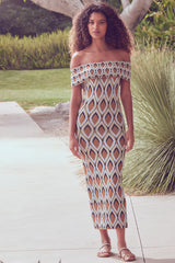 Avi is our newest knit midi dress. This figure-hugging, off-shoulder silhouette is in a brown printed knit jacquard. Fold-over band across the chest leads into a fitted skirt with a back slit.