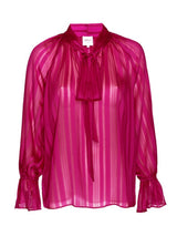 Statement-making chic, the Gracie top is cut from a semi-sheer fuchsia stripe chiffon.  Long sleeves with a ruffle cuff and a high neckline features a neck-tie that can be worn loose and undone for a laid back look or tied in a bow.  Pair with denim half-tucked for an effortless look.