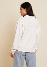 The ultimate relaxed fit with a little feminine touch, featuring a collar, center front placket, drop shoulders, side slits and elastic cuffs.