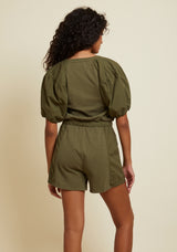 Keep it simple with this playful, feminine romper. Ties to cinch the waist, patched short with slant pockets and of course, a touch of romance a la tiered, poplin contrast puff sleeves. Plus, button placket down the front for the option to show a little extra skin.