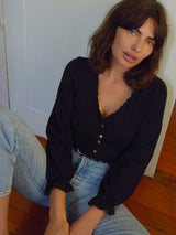 This Edwardian-inspired tee's got signature gold cap snaps and a vintage fit and feel. Think of it like a corset you can actually breathe in. Perfect for when you need just a touch of romance in your every day. Elastic at wrist.