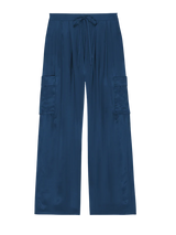 Looks like going out. Feels like staying in. Wide leg cargo pants in luxe Hammered Satin with a drawstring waist, gathered pleats, side pockets with patch pockets below, and a flattering, relaxed fit
