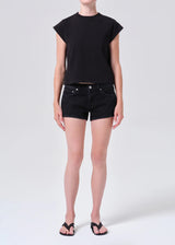 A modern take on our best-selling Parker, the Low Rise Parker Short sits loose and low on the hips with a subtly curved hem that creates a more refined, feminine shape. Designed in a dark lightly worn-in black wash, this pair channels the ease of the perfect vintage cut-off with a clean, updated finish. The relaxed rise and easy drape maintain the effortless appeal of the original, while the refined lines offer a flattering, laid-back silhouette. Crafted from non stretch, weightless regenerative cotton denim washed down for a super soft feel, these shorts deliver light, effortless comfort while holding their structure.