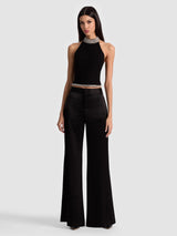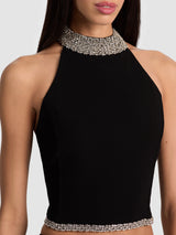 Introducing After Five, our new cocktail dressing collection--because it's 5 o'clock somewhere. Crafted from recycled matte satin crepe, our Gatz jeweled halter top stuns with a sculptural mock neck, a daring open back, and delicate crystal embellishments tracing the neck and hem. Its cropped cut adds a sexy touch, while the high neckline keeps things feeling polished. A true statement-maker--dress her up or down, she’s ready for anything.