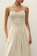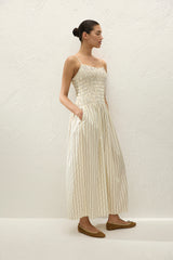 A seasonal maxi dress, designed from a signature 100% cotton. Shirred through the bodice with thin straps, adjustable in length, it features a gathered waist with relaxed side seam pockets before falling into a soft A-line skirt. With effortless throw-on throw-off appeal, style with a simple sandal for day to night dressing.