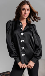 The Arly Bow Blouse is unapologetically bold. Cut in black satin with contrasting white bow details, this statement blouse balances feminine charm with dramatic polish. The fluid silhouette and puffed sleeves make it perfect for tucking into tailored pants or pairing with sleek skirts for an eye-catching look that transitions seamlessly from desk to dinner.
