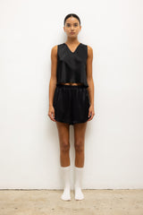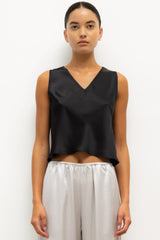 Cut in our Japanese-crafted Barb Satin, The Barb V Neck Shell is a sleeveless silhouette featuring a clean V neckline.