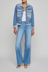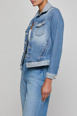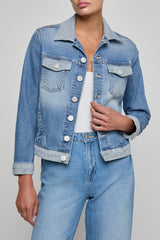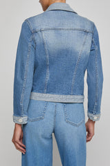 Our signature three-quarter sleeve jean jacket is back with a fresh update with light-wash contrast trim. Angled seams and chest pockets create flattering waist definition, while the structured fit keeps it polished. Wear it buttoned up as a top or layered over your favorite tee.