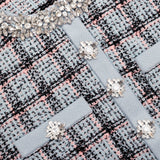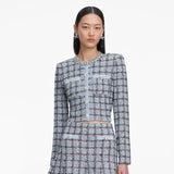 Bright and playful, textured knit meets a kaleidoscope of colours in this blue check cardigan. Diamanté buttons sprinkle on extra charm – pair with our matching skirt for a twist on the skirt suit.