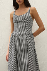 A vintage-inspired midi dress, designed from a signature 100% cotton, yarn-dyed in a nostalgic black and white gingham. Fitted through the bodice with a curved neckline and thin straps, adjustable in length, the waist is cut in a V-shape for a more flattering silhouette with subtle gathering at either side. From there it falls into a soft A-line skirt, cropping around the ankles.