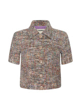 Classic, but make it fun. The Chita is a cropped, short-sleeved jacket crafted from a multi-colored tweed. Wear it as a top or layered over a bodysuit.