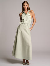 Crafted in crisp cotton poplin, the Eloise dress features a halter-style neckline with a pointed collar, open back, and a removable self belt that defines the waist. A full-length skirt creates an easy, structured silhouette.