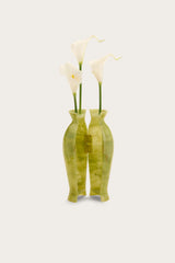 A marbled acrylic vase of calla lilies that opens for storage and functions as wearable art. Handmade with love, each Calla flower is unique.